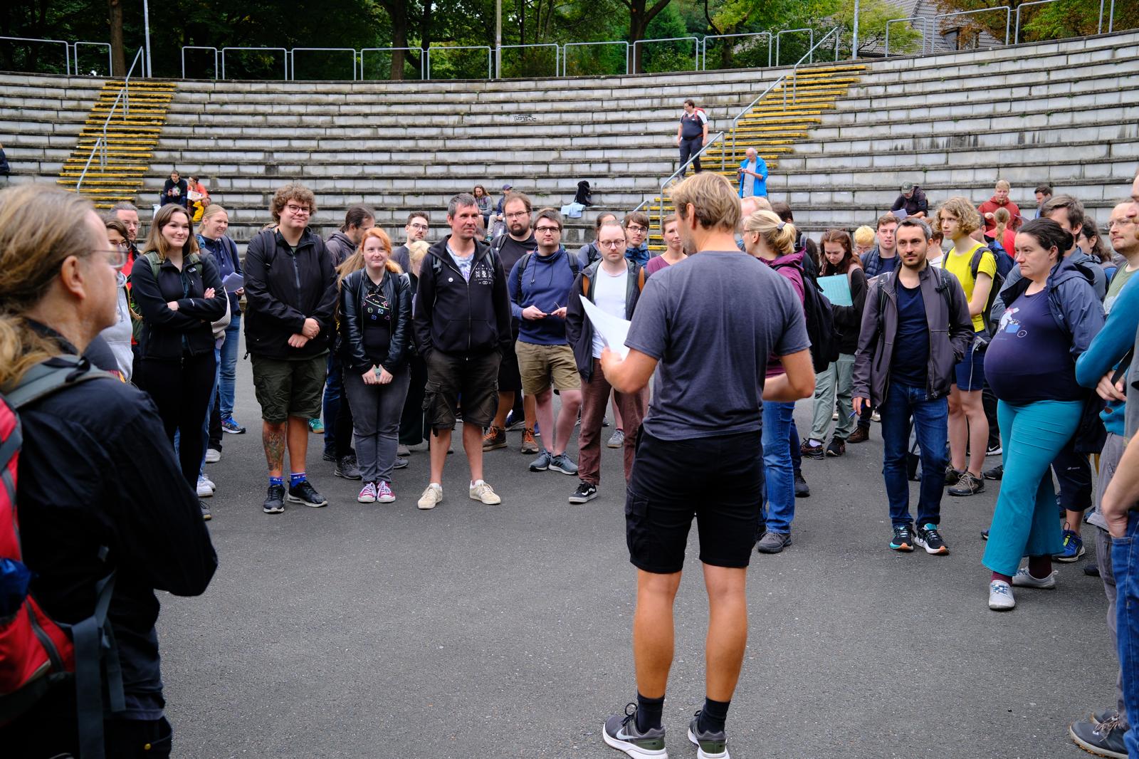 Auf dem Wege zur Siegerehrung fällt uns noch einmal auf, wie sehr die Strecke im letzten Abschnitt im Wesentlich aus "an Haltestelle ankommen, zum Rätsel laufen, den Weg zur Haltestelle exakt wieder zurücklaufen, zur nächsten Haltestelle fahren" bestand. Bei der Distanz zwischen den Rätseln und dem Bustakt scheint auch nicht wahrscheinlich, dass eine Laufstrecke sinnvoller gewesen wäre. Im Vergleich zum ersten Teil des Tages wirkt das ein wenig schade - aber im Vergleich zum "eigentlich hätte ein Ein-Fahrten-Ticket gereicht" aus manchen Vorjahren ist das schön, mehr Teile von Essen besucht zu haben. Insgesamt fanden wir sehr schön, dass uns die Strecke immer wieder ins Grüne und ans Wasser geführt hat - "gans viel Wasser" passt als Motto definitiv.